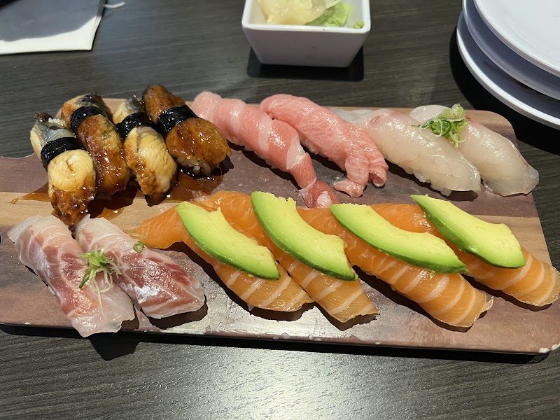 Modern sushi restaurant with a large conveyor belt laden with rolls & sashimi, plus a bar.