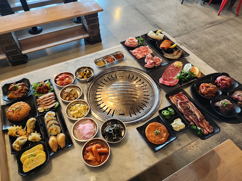 테이블 그릴이 갖춰진 현대적인 벽돌 인테리어 공간에서 전통 한국식 바비큐를 즐길 수 있습니다.
